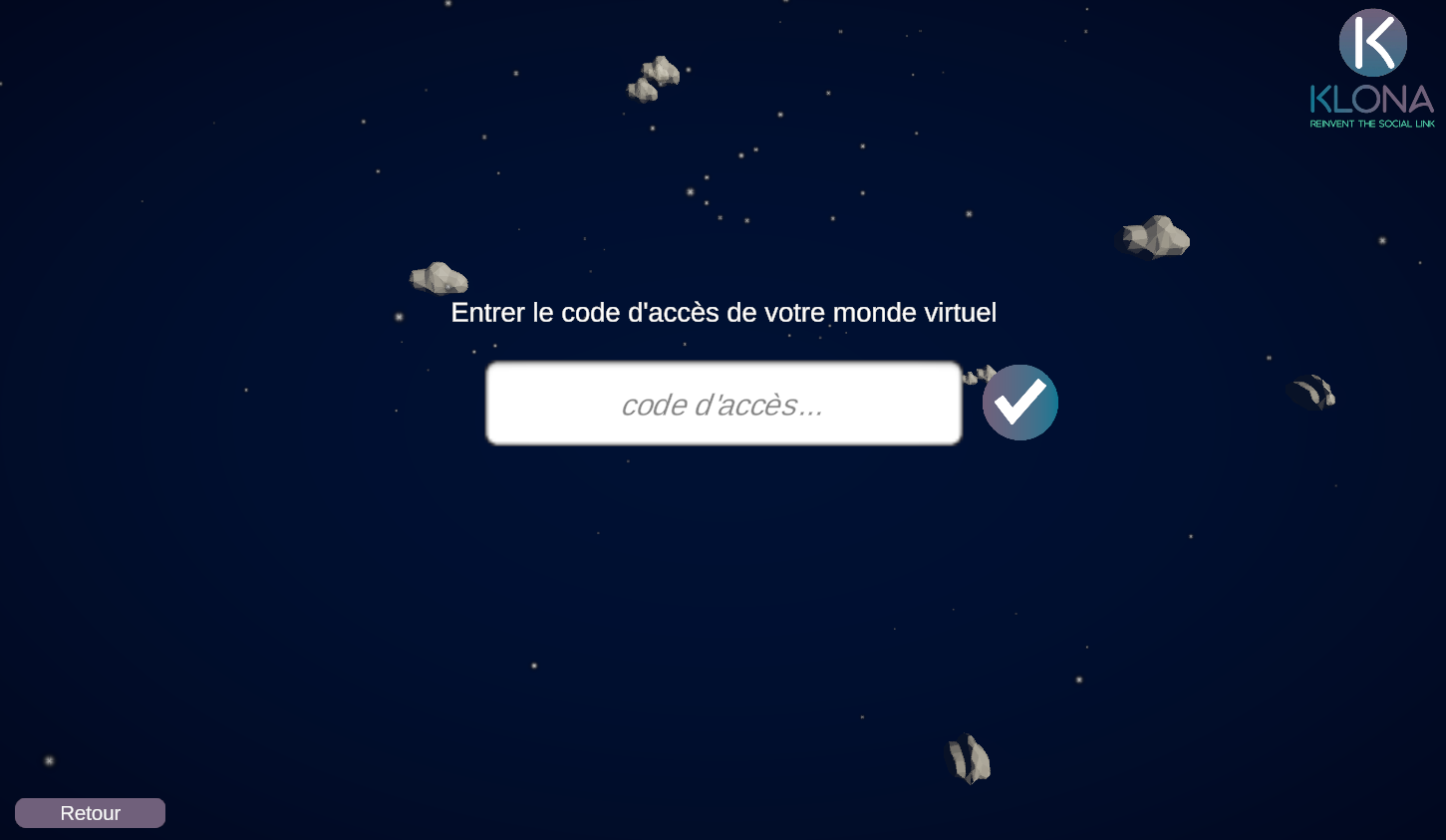 The organizer has provided you with an access code to enter the virtual world, enter this code and enjoy all of Klona's features!